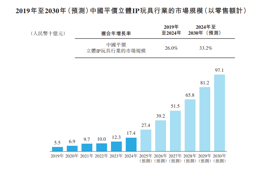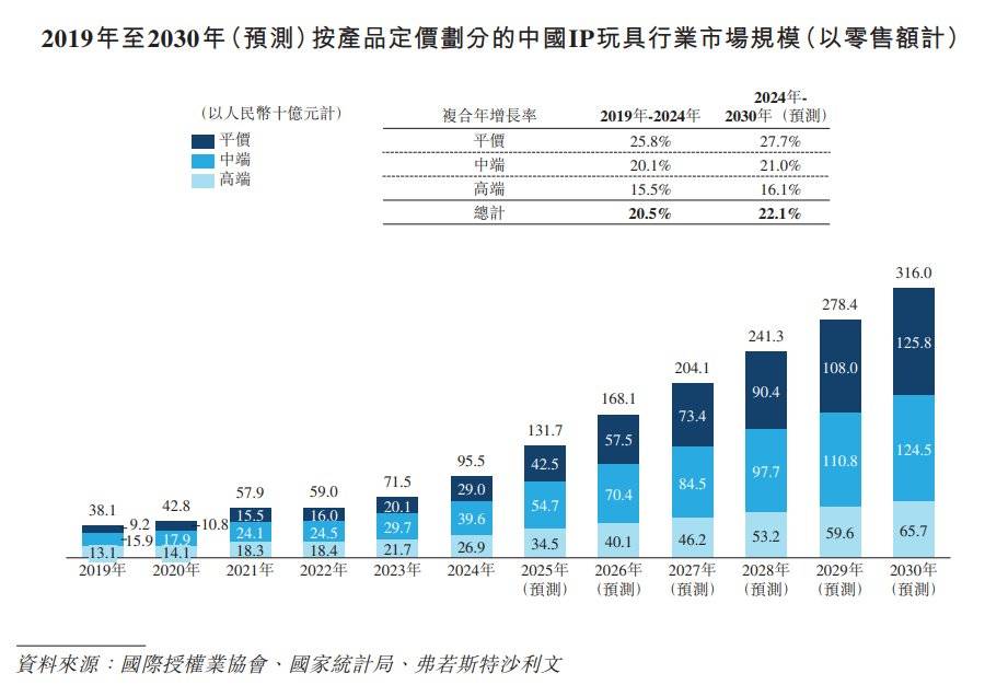 根据弗若斯特沙利文的资料,按零售额计,中国平价IP玩具行业的市场规模已由 2019年的人民币92亿元增长至2024年的人民币290亿元,复合年增长率约为25.8%,并预计于2024年至2030年间按27.7%的复合年增长率增长,成为中国带动IP玩具行业扩张的一个重要细分赛道。