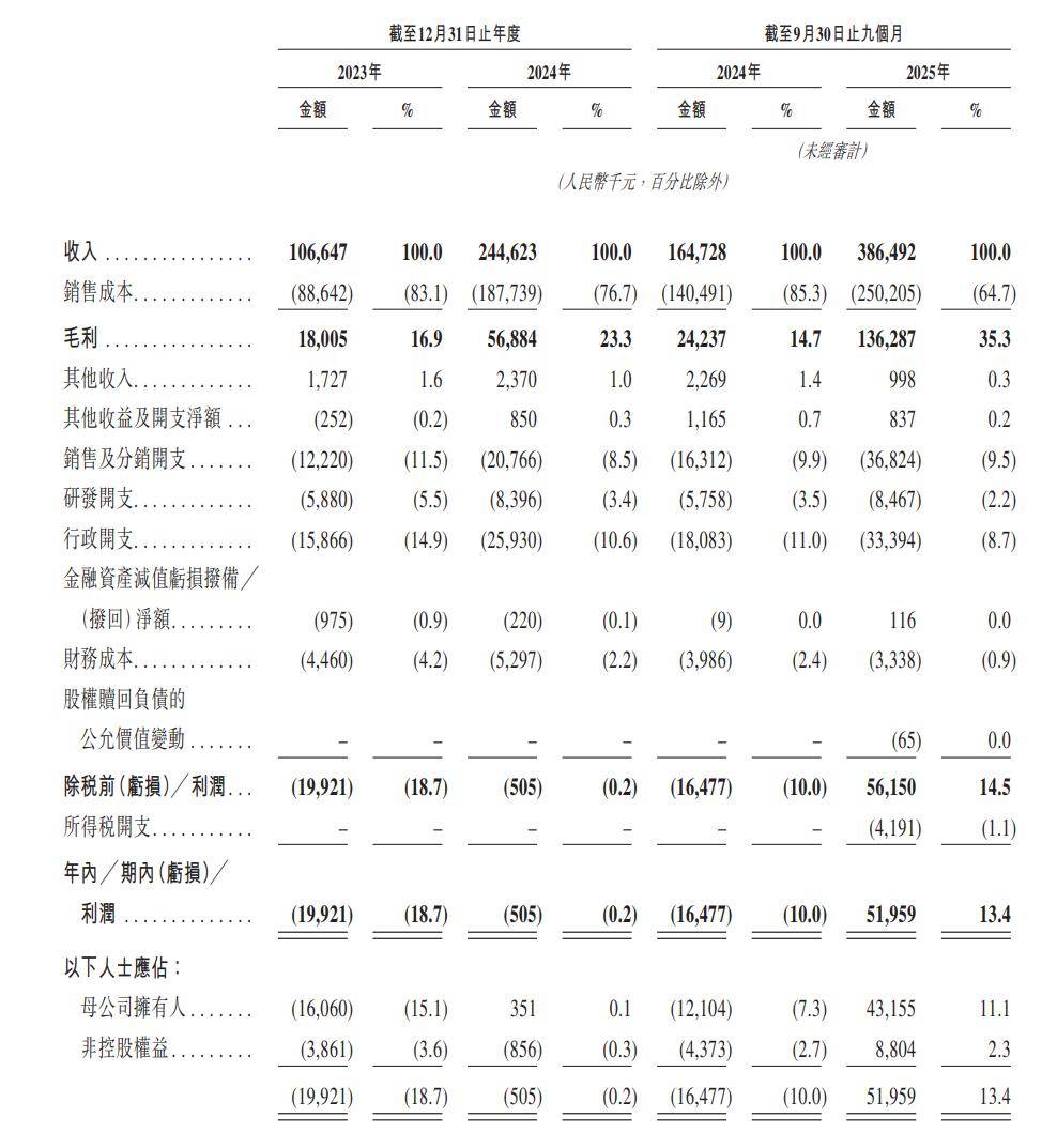 于2023年度、2024年度以及2025年截至9月30日止九个月,公司实现毛利分别为1800.5万元、5688.4万元、1.36亿元。